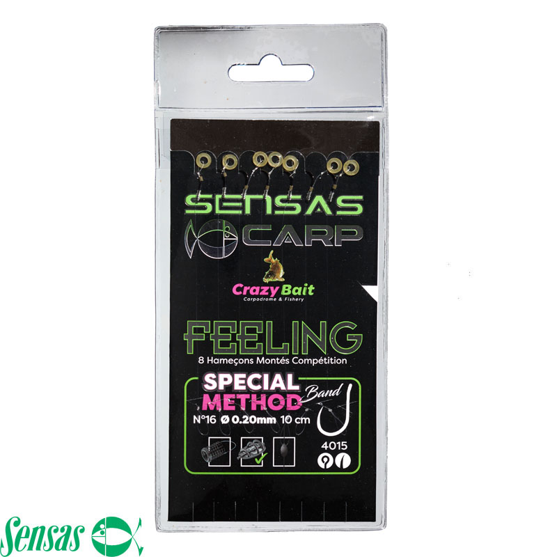 Kant-en-klare 10 cm lange onderlijn met Sensas 4015 Barbless Eye haak en hair rigged bait band. Ideaal voor harde pellets. Special voor de method feeder.